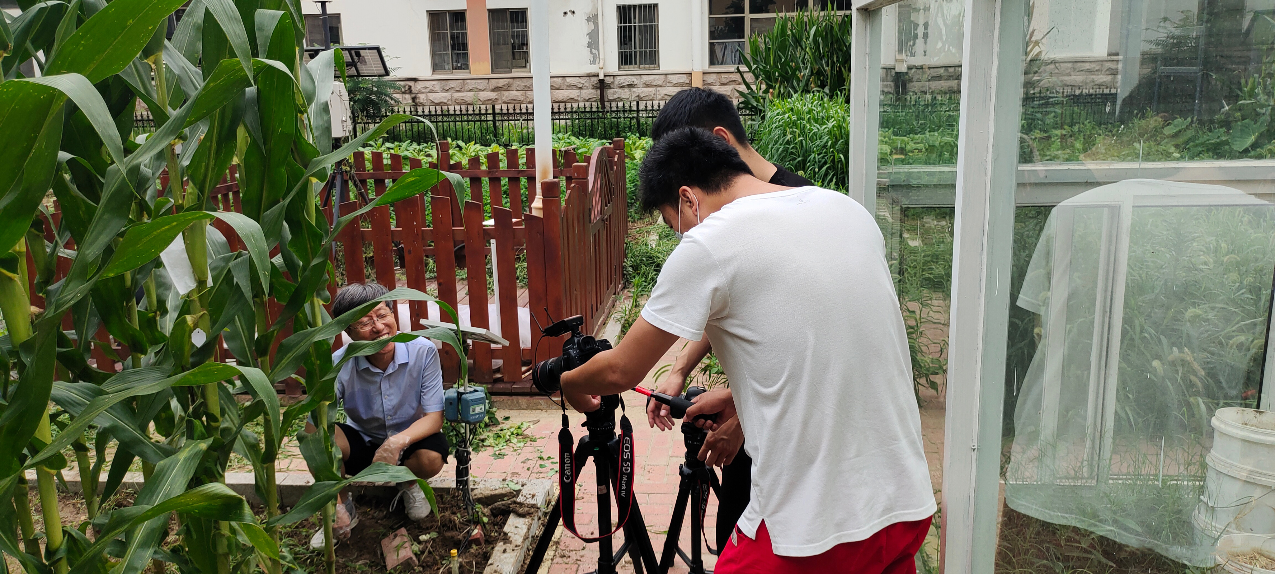 7月11日,beat365正版唯一官方网站教授杨锦忠在作物认知园进行玉米花粒期栽培实验视频拍摄工作。拍摄前,他根据场景需要,选择有代表性的玉米植株,与导演和摄影师交流成片的要求,确定分镜机位,为了达到理想的效果往往需要重复拍摄几次。尽管天气炎热,杨锦忠还是坚持拍摄完了玉米花粒期田间素材。暑假期间,项目团队各位专业教师克服疫情困难,冒酷暑抢农时,如期开展水稻、玉米、大豆等作物的实验课视频录制。