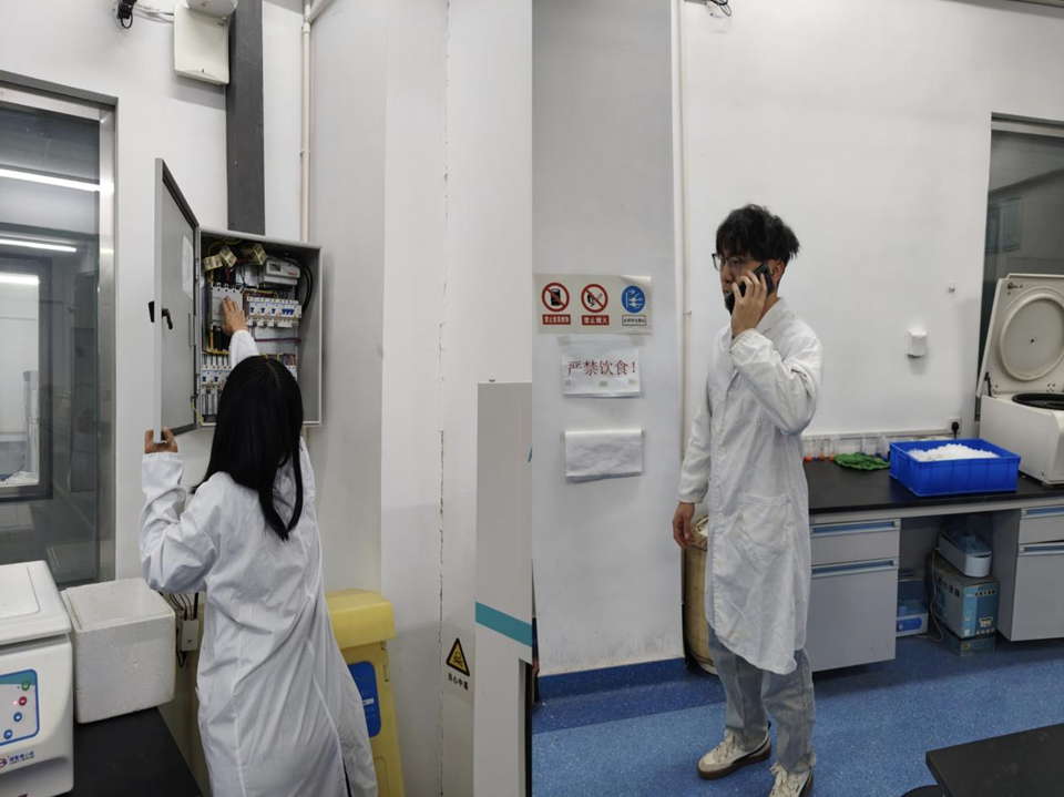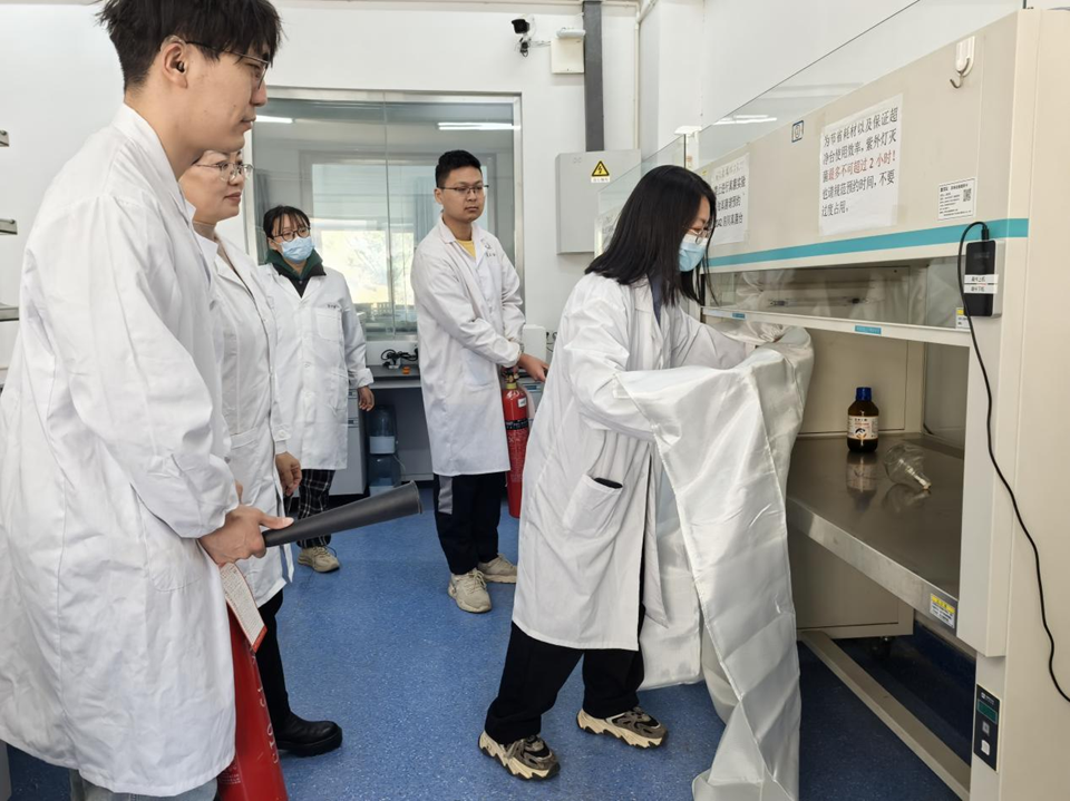 安全演练在教学实验室与科研实验室同步开展,聚焦化学品泄漏、电器设备起火、酒精灯火灾等常见高风险场景,覆盖化学品泄漏、电器设备故障起火、酒精灯着火等高频风险场景。在教学实验室演练中,由裴玉贺、王维华老师指导,针对学生在实验过程中出现电器故障起火进行应急演练,模拟电泳仪电源设备因线路老化短路引发火情,伴随浓烟产生。现场实验人员第一时间发现险情,立即按下紧急断电按钮,切断设备总电源,同时高声呼救并通过拨打电话向演练指挥部上报,明确告知起火位置、火势大小及是否有人员被困。接到报警后,应急处置小组迅速响应,赶赴现场。安全员根据起火设备类型,选择适配的二氧化碳灭火器,按照“提、拔、握、压”规范操作流程,对准火源根部精准喷射;辅助人员同步使用灭火毯覆盖周边易燃设备,防止火势蔓延。期间,现场设置警戒区域,专人引导参与师生弯腰低姿、捂住口鼻,沿安全疏散通道快速有序撤离至指定集合点。