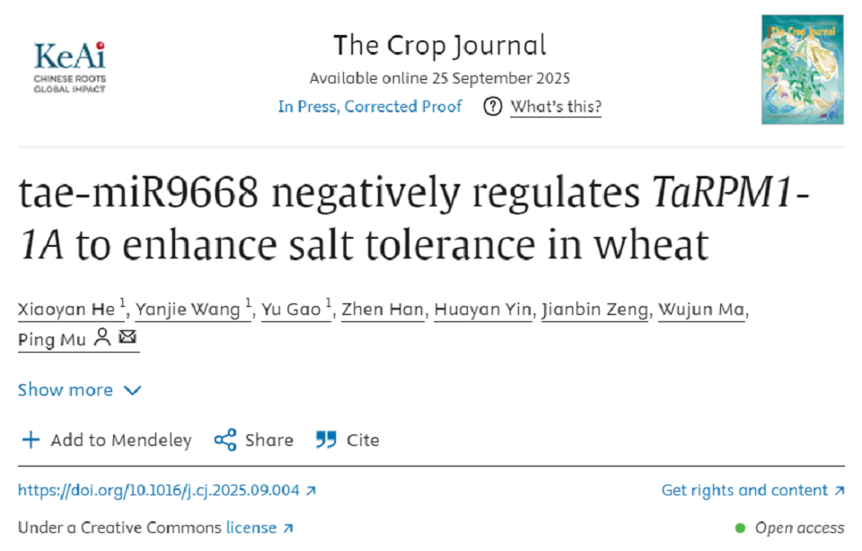近日,beat365正版唯一官方网站穆平教授课题组在The Crop Journal(中国科学院1区TOP期刊,影响因子5.6)上,在线发表了题为“tae-miR9668 negatively regulates TaRPM1-1A to enhance salt tolerance in wheat”的研究论文。该研究系统解析了tae-miR9668–TaRPM1-1A模块在小麦耐盐中的调控作用,并进一步发现TaRPM1-1A与TaSnRK1.3-D的互作关系,为小麦耐盐分子育种提供了新靶点。