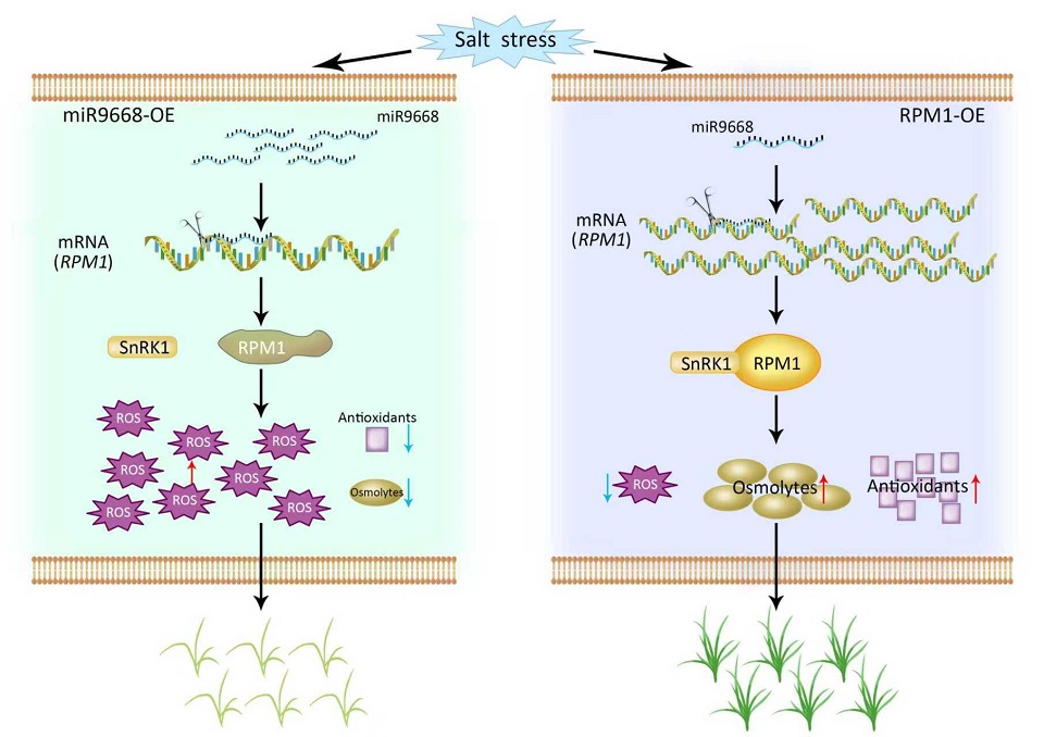 土壤盐渍化是全球农业生产面临的重大挑战,严重影响小麦等主要粮食作物的生长发育和产量形成。挖掘耐盐基因并解析其分子机制,对培育耐盐小麦品种、保障粮食安全具有重要意义。MicroRNA作为一类重要的调控因子,在植物响应非生物胁迫中发挥关键作用。穆平教授课题组前期研究发现小麦microRNA tae-miR9668在盐胁迫下显著下调,其预测靶基因为TaRPM1-1A。该研究首先从耐盐小麦品种“青麦6号”中克隆了该microRNA及TaRPM1-1A,表达分析证实,盐胁迫下tae-miR9668显著下调,而TaRPM1-1A在根中显著上调。功能验证表明,过表达TaRPM1-1A可显著增强小麦耐盐性,而过表达tae-miR9668则抑制TaRPM1-1A表达,降低小麦耐盐性。分子机制研究显示,tae-miR9668通过直接切割TaRPM1-1A的mRNA,负调控其表达;TaRPM1-1A能与同样具耐盐功能的TaSnRK1.3-D直接互作并被其磷酸化。该研究提出了tae-miR9668–TaRPM1-1A模块调控小麦耐盐的工作模型,为理解小麦响应盐胁迫的分子网络提供了新视角,也为利用该模块培育耐盐小麦品种奠定了理论基础。