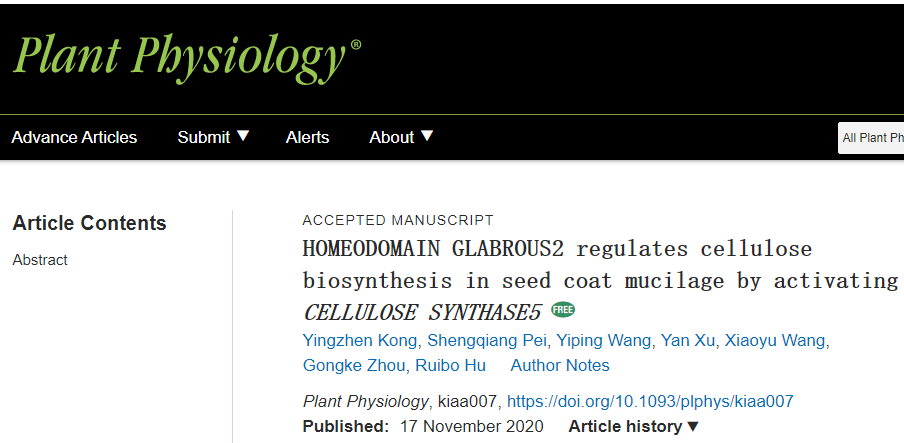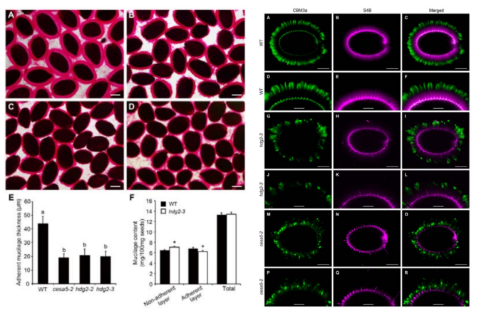 近日,beat365正版唯一官方网站资源植物与环境工程创新团队成员beat365正版唯一官方网站孔英珍教授及其合作者首次发现了拟南芥种皮粘液质中调控纤维素合成的转录因子HDG2,揭示了其在种皮粘液质中参与纤维素合成转录调控的分子机制。相关研究内容『HOMEODOMAIN GLABROUS2 regulates cellulose biosynthesis in seed coat mucilage by activating CELLULOSE SYNTHASE5』于11月17日在线发表在《Plant Physiology》(中科院分区:1区,期刊影响因子:7.1)上(原文链接:https://academic.oup.com/plphys/advance-article/doi/10.1093/plphys/kiaa007/5985557)。