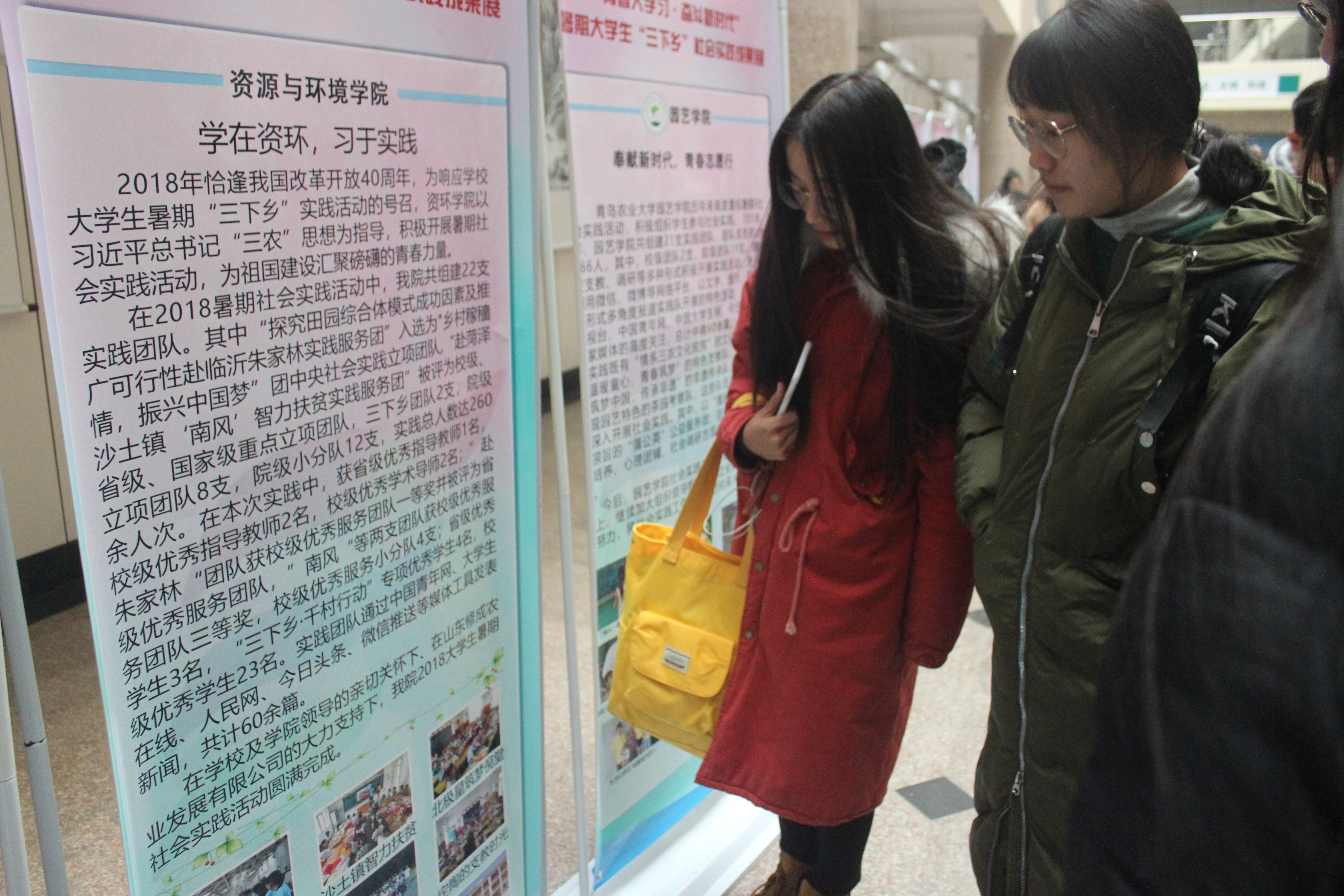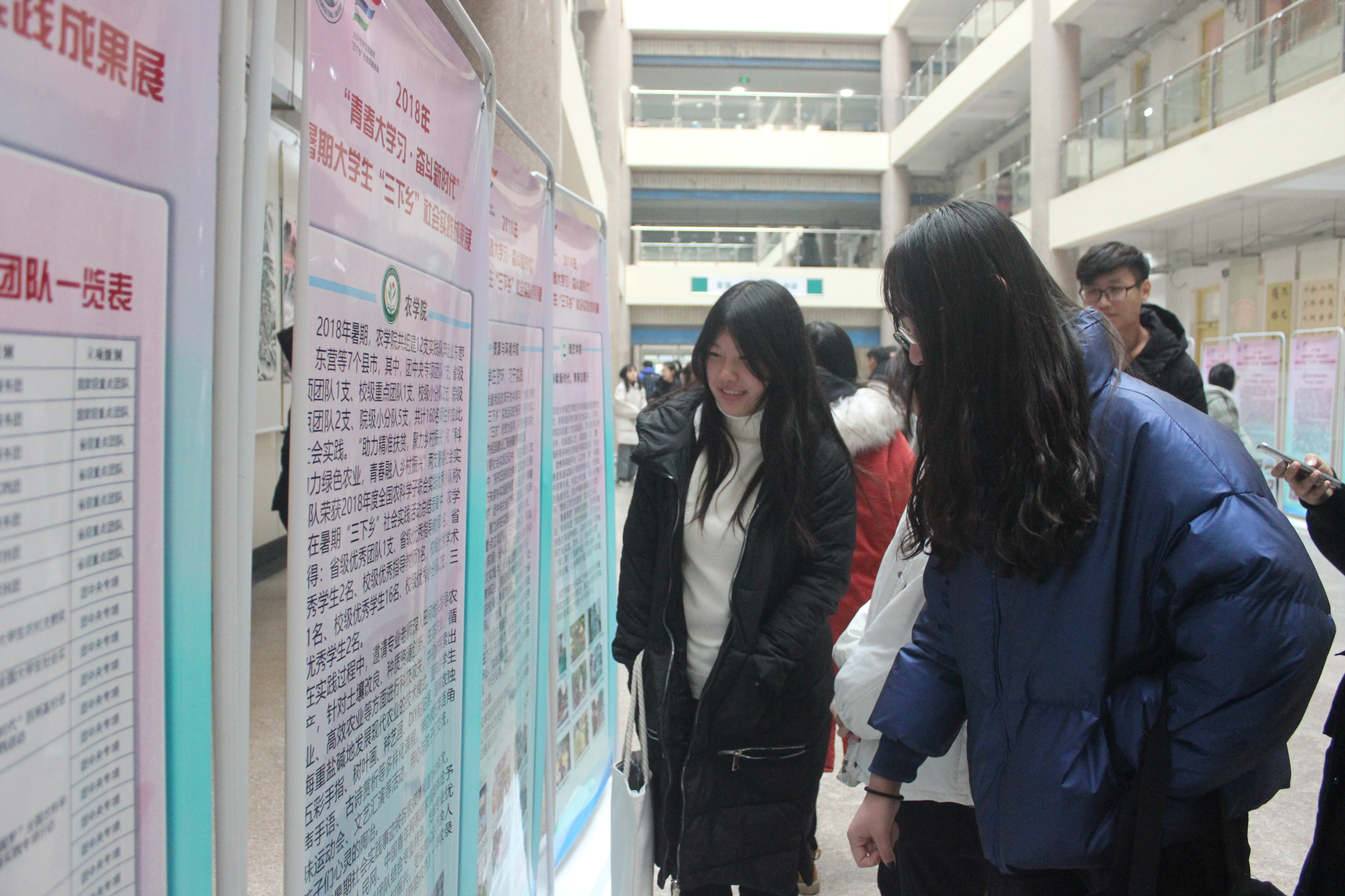 为增强学生社会服务意识,培养学生的创新实践能力,12月13日,在beat365正版唯一官方网站团委的带领下,学院师生代表到教学区A区大厅对暑期实践成果展进行参观交流。
