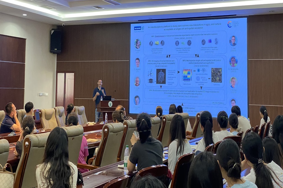 Filip Rolland介绍了其团队在糖信号转导和关键蛋白激酶SnRKs研究上的成果,特别是SnRK1在调控植物初生与次生代谢、生长发育以及应对环境胁迫中的关键作用,深入探索了其下游转录与转录后调控的复杂网络。Filip Rolland深入浅出介绍了SnRK1如何作为能量感应器,监测并维持植物能量平衡,以及它在这些过程中的具体功能和机制。报告结束后,Filip Rolland与在场师生进行了互动交流,现场学术气氛热烈。