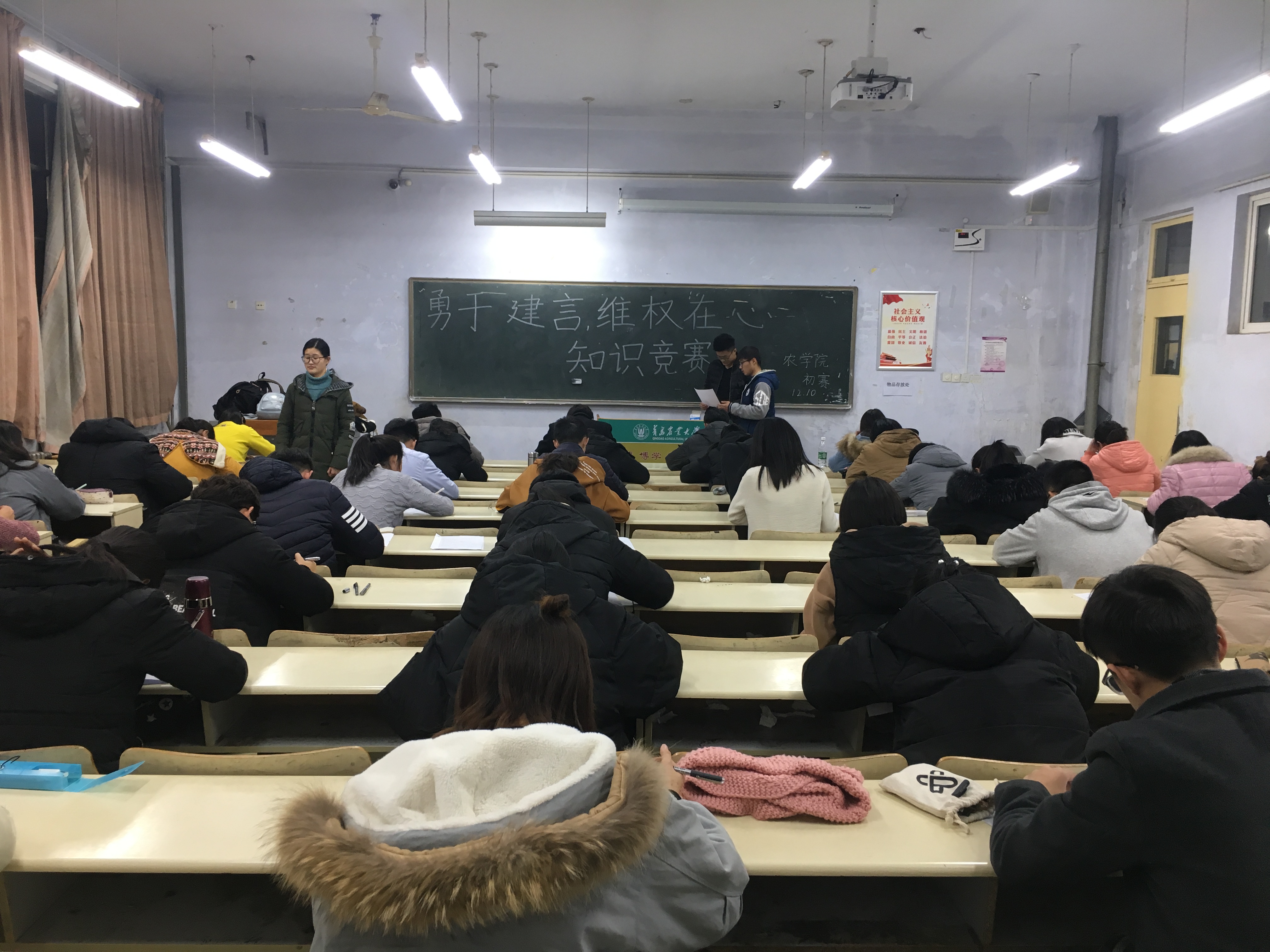 beat365正版唯一官方网站于12月10号举行初赛,同学们都积极参加。前期由生活部与学习部经过开会讨论从题库选择一部分重点作为初赛试题并打印试卷,试题中也增加开放性的题目来考察学生的思维。我院参赛学生于12月10日晚团课结束后到考试教室进行初赛,我们安排各班参赛选手坐在相应位置,在气氛得到活跃的同时,也以便总结各班到位情况,作到细致入微。我们生活部与学习部分工合作、齐心协力、务求在有限的时间里把会场布置的美观。并由生活部与学习部干部一同在考试期间进行监督,防止不公平行为的发生。考试结束后,由生活部与学习部一起进行不差别批卷,每个人分别批阅不同试题以提高批卷效率。