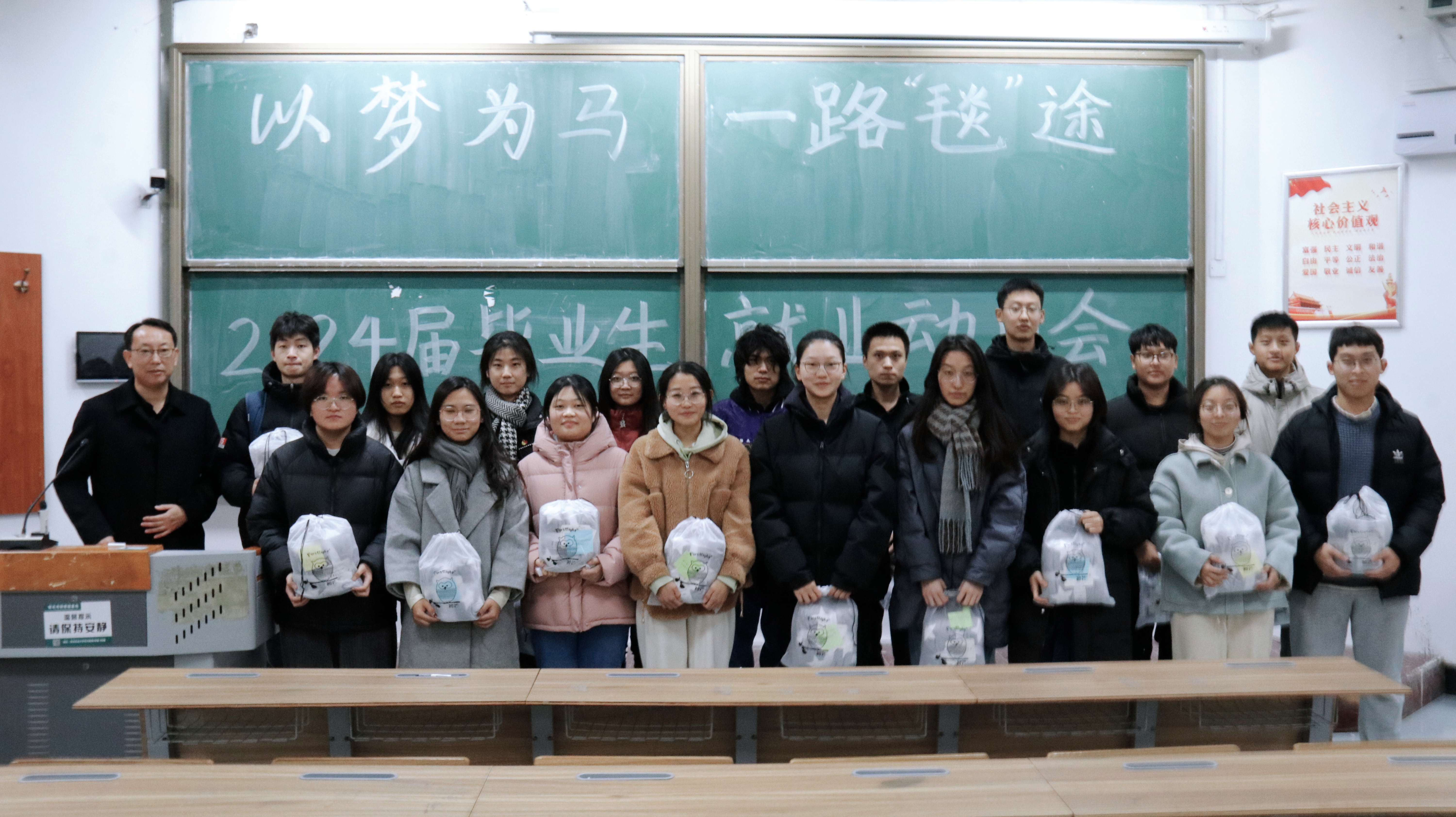 2020级班主任为各班学生代表送上学院准备的毛毯礼包,礼包中放有亲笔祝福的字条,希望能在严冬中给奋斗的同学们送去温暖。会后各班合影留念。