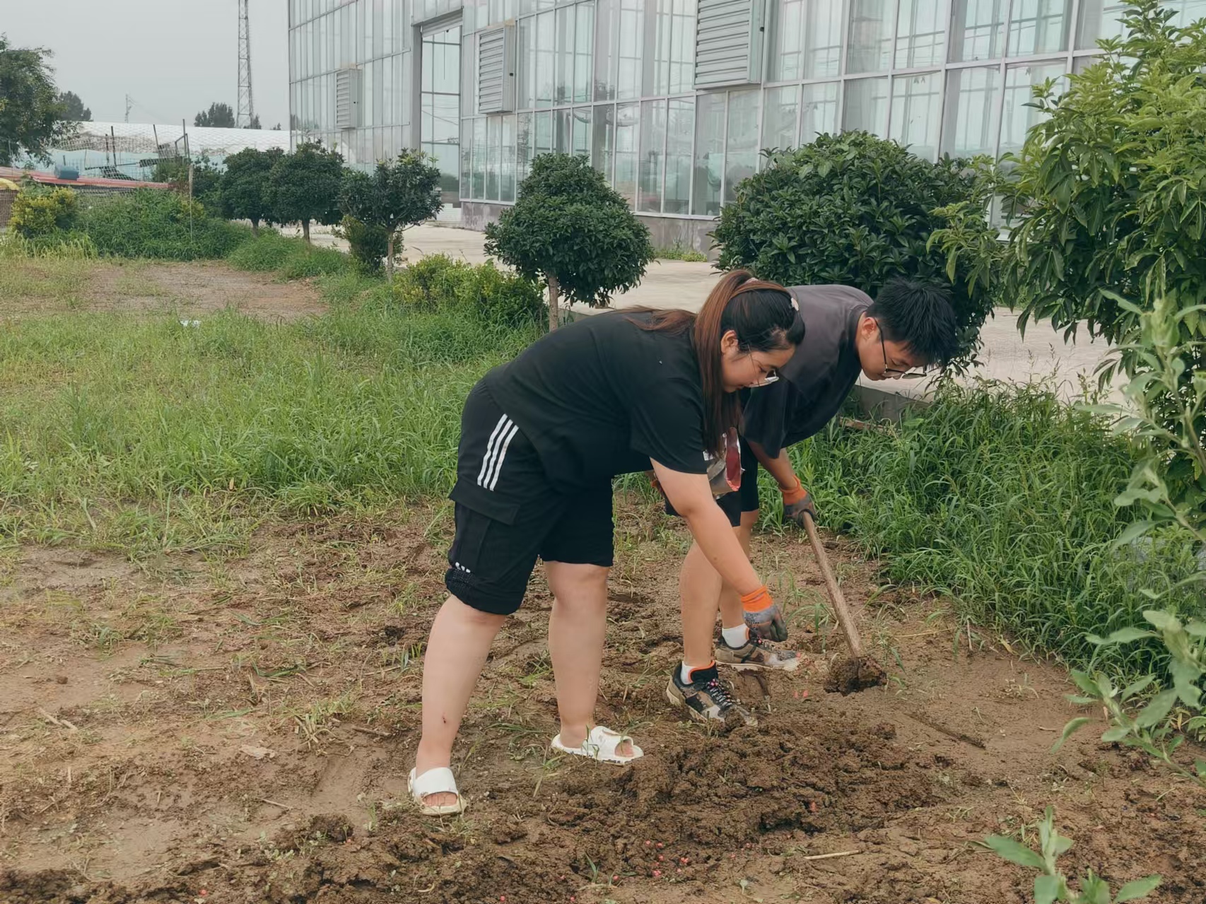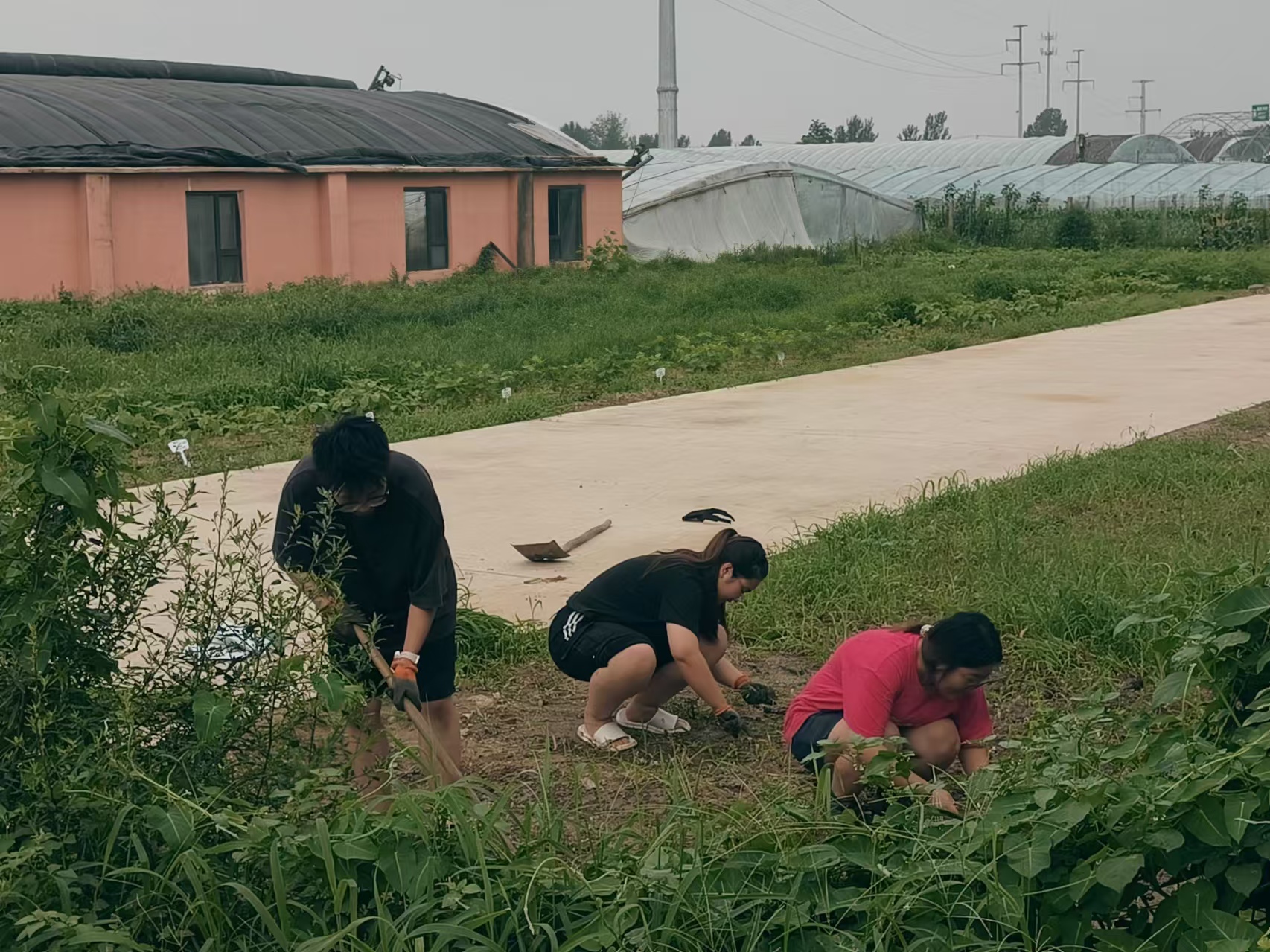 随后,团队成员在姜波的示范指导下,以饱满的精神状态认真投入到玉米种植活动中,他们先是仔细清除了玉米地的杂草,为玉米种子提供一个良好的生长环境,防止杂草与幼苗争夺养分。随后,大家挥起锄头,挖出宽度和深度适合的土坑,将玉米种子均匀地撒在土坑里,并进行了覆土。通过亲身体验、实际操作,实践团队渐渐了解了玉米种植的注意事项,体会到科学精耕细作、坚守粮食安全的初心与执着,在一定程度上 ,既学习了相关涉农种植技术,也拉近了与企业技术人员和务农村民的关系。