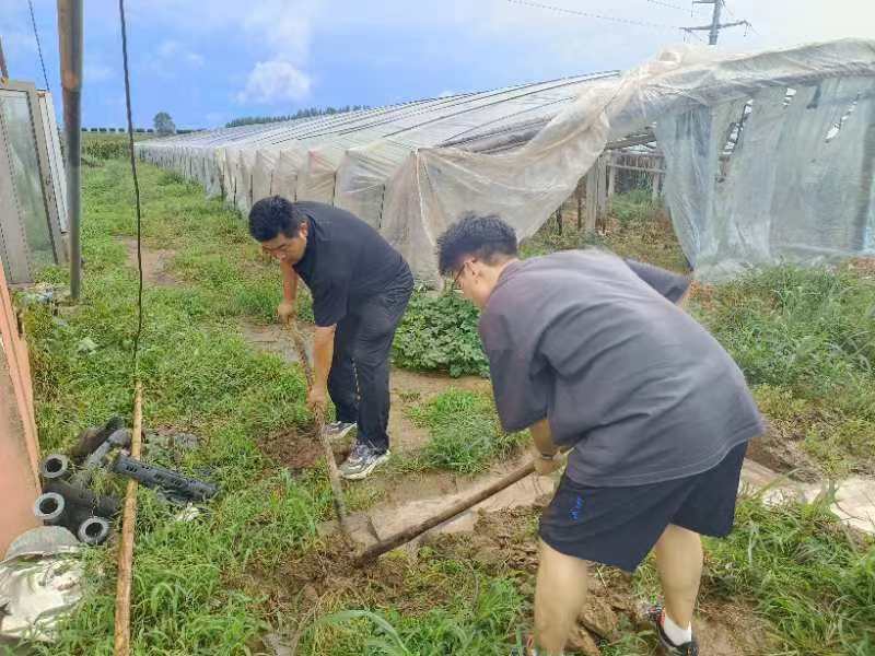 姜波带领实践团队查看了受淹地玉米长势情况和农田积水情况,在简单的分工后,大家纷纷撸起袖子和裤腿、拿起铁锨,采用抽水泵、挖通排水沟等方法加速排水,帮助村民疏通堵塞沟渠,保障沟渠排水流畅,防止农作物受淹。经过长达6个小时的防汛排涝工作,农田积水状况显著好转。