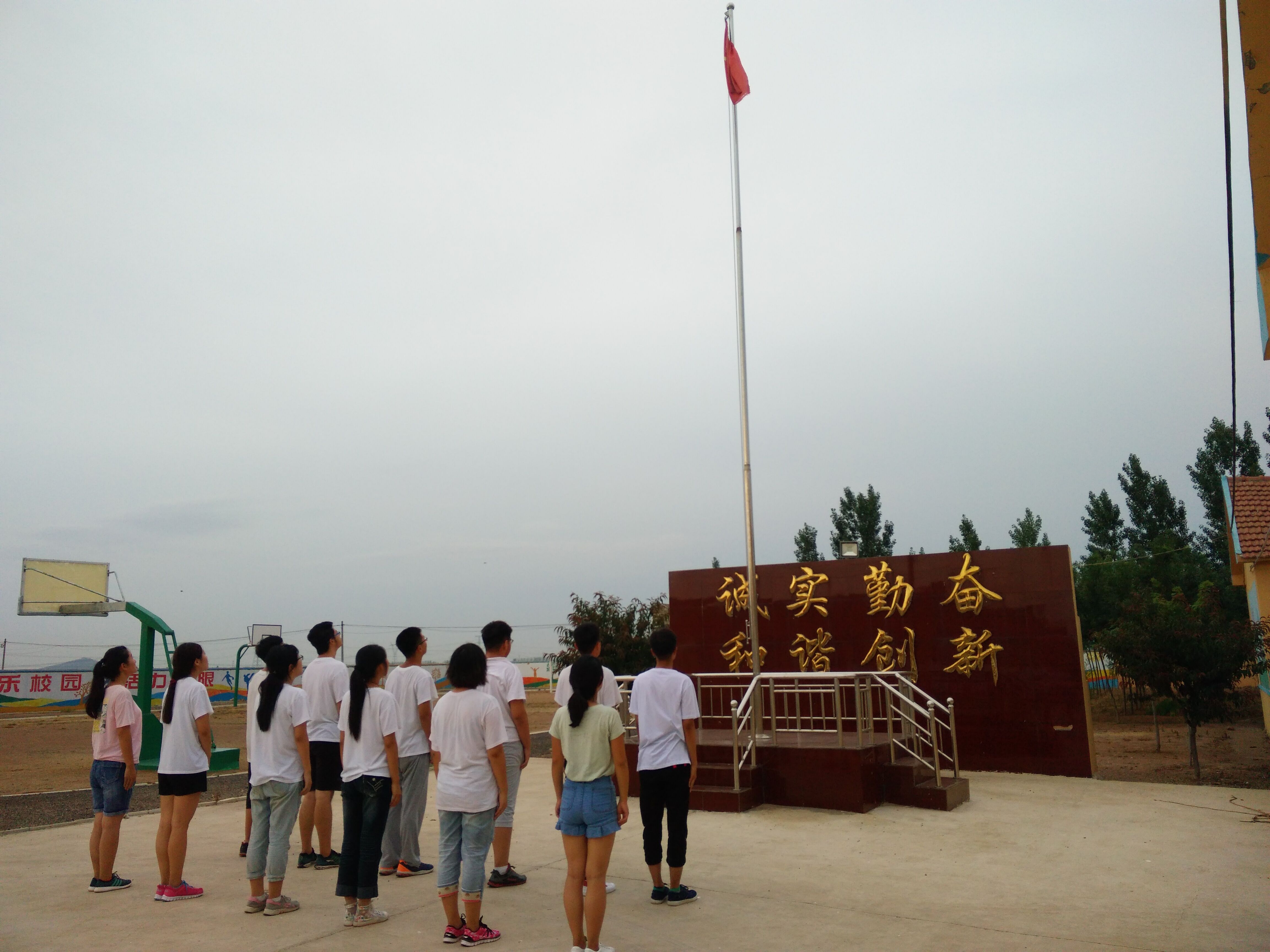 在节奏紧凑的生活中,队员们也遇到过一些些趣事,缓解了紧张的神经。比如早晨晨跑时村子里夹道欢迎的大狗小狗,和着七零八落的狗叫,为我们的晨跑加了一点协奏曲。还有凌晨一点从女生宿舍地铺上横行穿过的蝙蝠,为我们的实践生活增加了一些不一样的色彩。还有值得一提的是:每天早上的升旗仪式,会给我们带来一整天的力量。