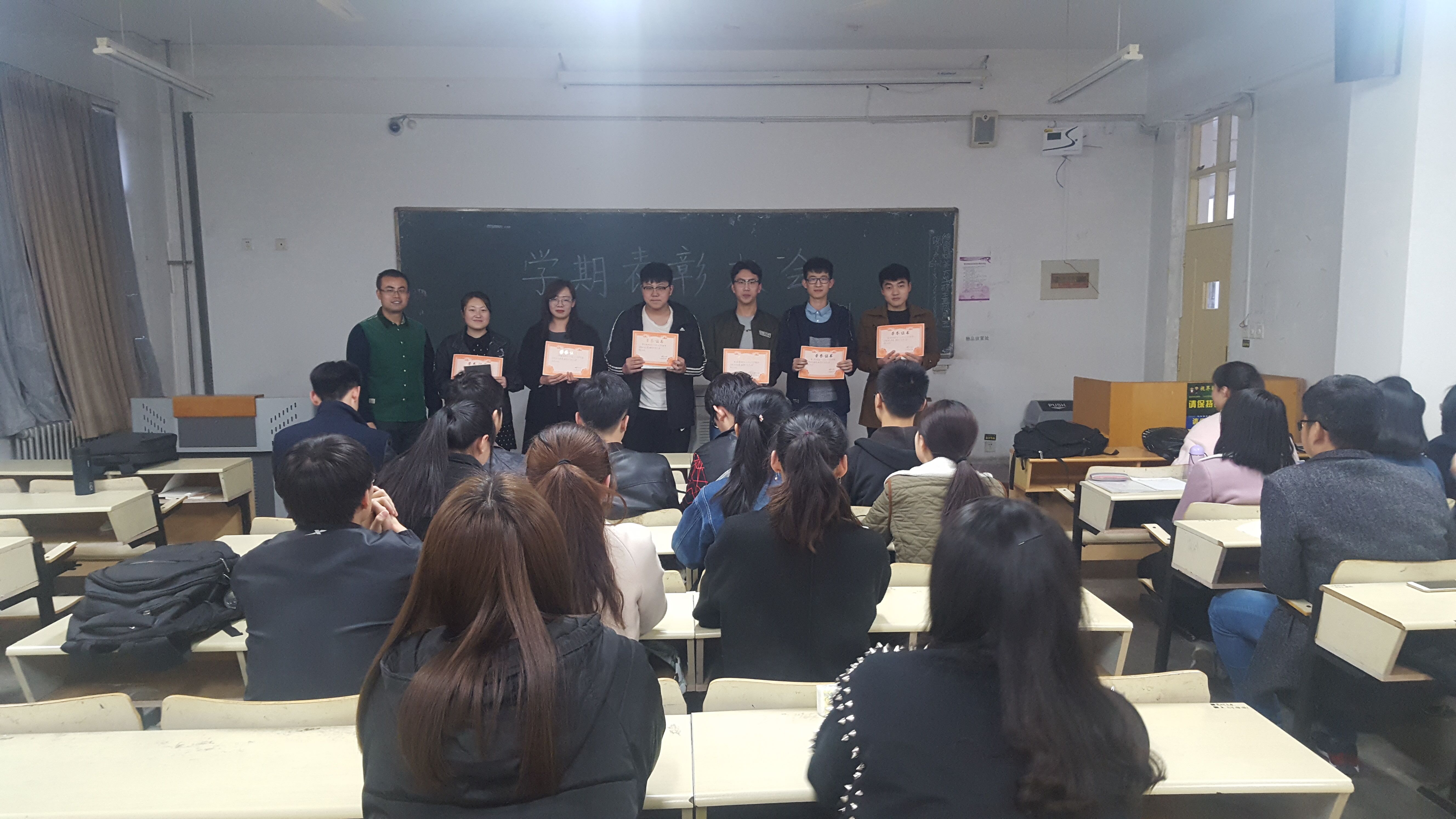 会议伊始,程浩楠对上学期成绩进行总结,宣读三好学生、优秀学生干部、班级优秀学生标兵以及进步标兵名单,郭磊向优秀同学颁发奖品并进行表扬。郭磊表示不论将来的方向是考研还是就业,目前都要以学业为主。他以进步标兵王雪雁和赵明惠为例提出:同学们要擅于调整自己,无论是生活、学习还是感情方面都要找到最适合自己、最积极的那一面。大家不只要和自己比较,也要和周围同学比较,只有在比较中才能不断进步,成就更好的自己。