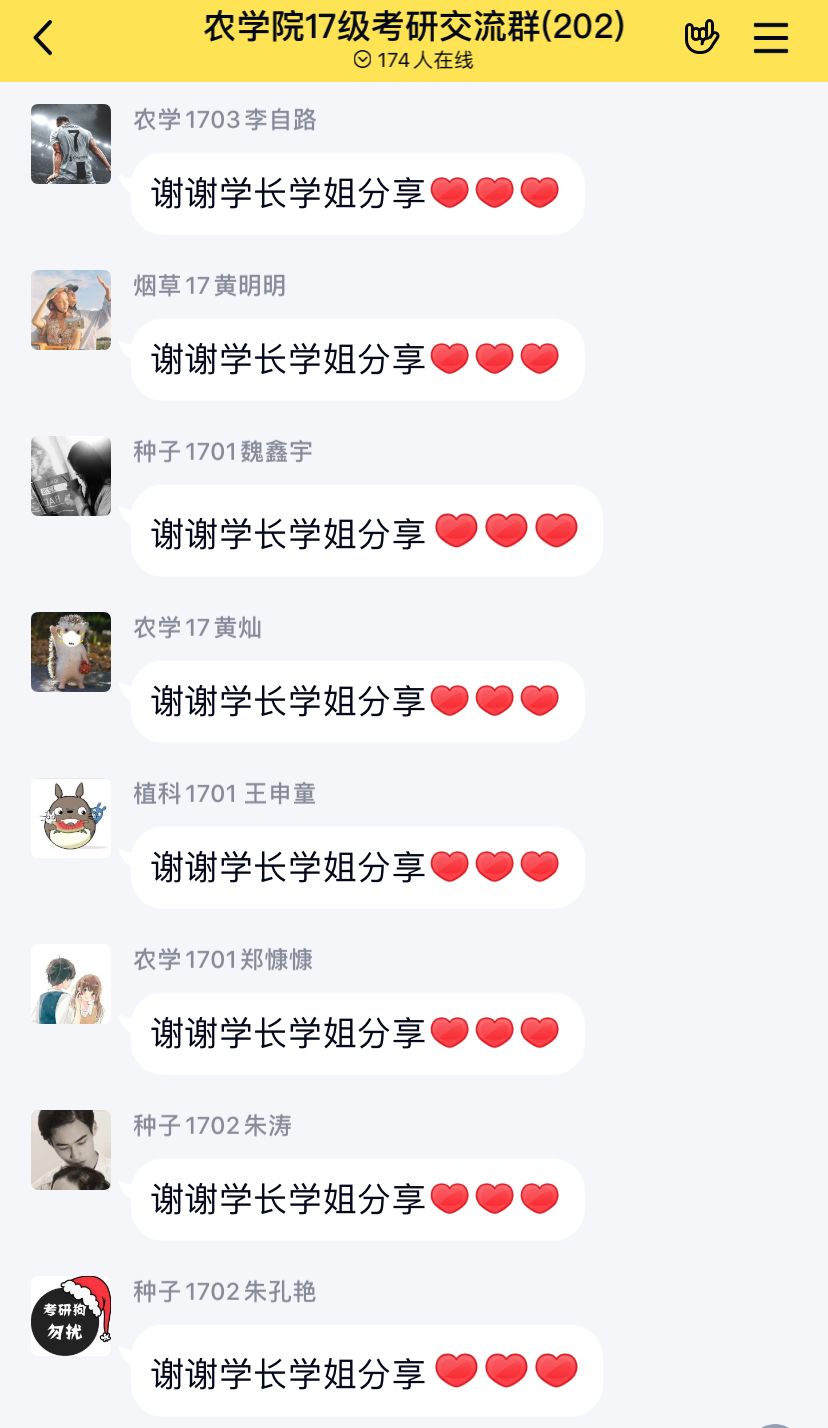 本次大会分为“经验分享”和“答疑解惑”两个环节。学院邀请中国农业大学翟杉杉、刘萌萌、许亚男和华中农业大学惠凤娇、马学峰、王先领、刘学伟等7名优秀考研学生“以身说法”为同学们分享考研经验,包括院校与专业选择、考研复习策略、备考心态调整等方面。翟杉杉表示,考研是一项持久战,备考期间要学会合理安排自己的学习作息时间,学会不断为自己树立信心,不要轻言放弃。许亚男根据自己的复习经验总结了四点注意事项:一要重视专业课学习;二要提早开始复习;三要注重学习效率;四要放平心态,根据自己进度走。最后,刘宁从为什么考研、如何备战考研等方面,为同学们分析了考研的形势与动态,鼓励同学们选择考研,为将来更好的就业打下基础。在答疑解惑环节,同学们就备战考研中存在的困惑积极提问,与会老师和分享经验的嘉宾们一一详细解答,形成良好的线上互动氛围。