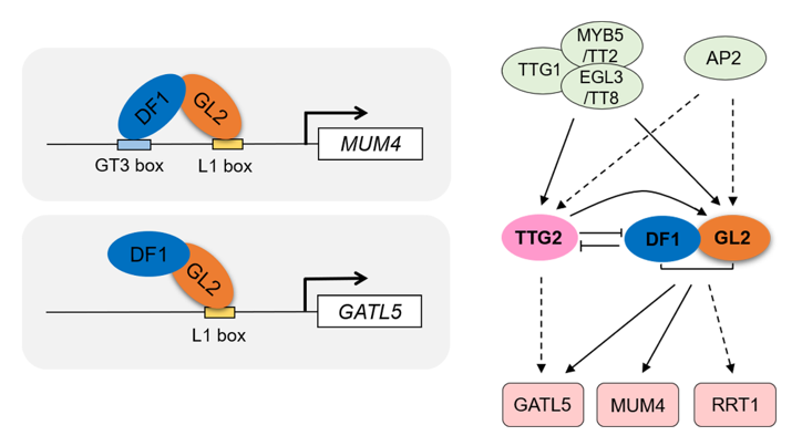此外,该研究还发现DF1与GL2的表达均受到TTG2的直接调控,TTG2通过结合DF1与GL2启动子中的W box元件从而抑制DF1的表达,激活GL2的表达。有趣的是,DF1亦能直接抑制TTG2的表达。因此,在转录水平上DF1与TTG2之间存在一个负反馈环。