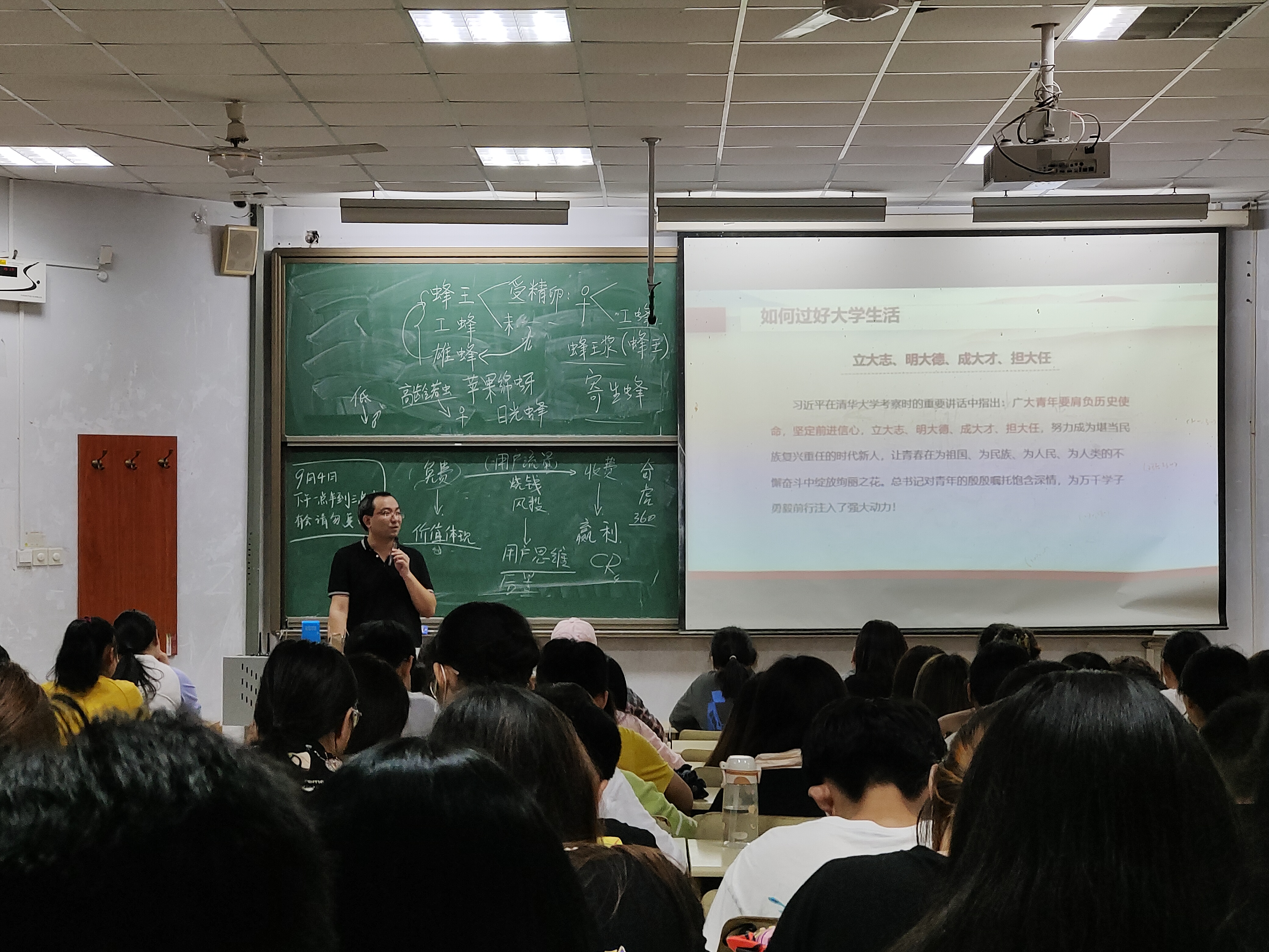 学院党总支书记在平度校区明德楼多功能厅为2021级新生讲授以“不一样的大学,不一样的人生”为主题的开学第一课,她结合自身经历,从“我为什么要上大学”、“我来大学要做什么”、“未来我要做什么”等三个方面讲解了大学生活如何度过,对新生提出四点希望:一是要知史爱党,知史爱国,树牢“四个意识”,坚定“四个自信”,做到“两个维护”;二是要以强农兴农为己任,成为乡村振兴的主力军,做懂农业、爱农村、爱农民、有理想、有本领、有担当的“一懂两爱三有”三农领军人才;三是要科学有序防控,做好自身防护,严格遵守日常行为规范、严格遵守重点场所管理,及时做好信息报送、个人卫生防控和心理健康防护;四是要增强安全意识,提高防范能力,培养积极的“生命观、生存观、生活观”。讲解过程中,张玉梅积极与同学们互动,拉近了与同学们之间的距离。