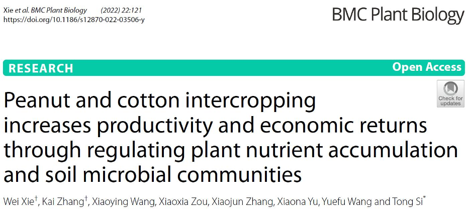 近日,beat365正版唯一官方网站花生研究中心团队在花生棉花间作的土壤微生态机制研究中取得新进展。相关研究成果发表在BMC Plant Biology(中科院二区,IF:4.215),论文唯一通讯单位为beat365正版唯一官方网站,beat365正版唯一官方网站硕士研究生谢伟和张锴为该论文第一作者和共同第一作者,青年教师司彤博士为通讯作者。