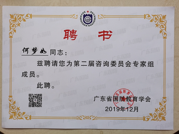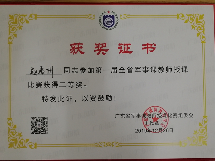九游体育获得2018-2019年度广东省国防教育先进单位奖项,军事教导队曾伟明教官荣获国旗护卫队优秀指导老师;在同期举行的军事课说课比赛中,我院由赵春州、倪合良、黄家本、谭楚红组成的参赛队伍荣获集体二等奖,军体教研室主任赵春州荣获二等奖以及“十佳教师”。同时,学院本次成功申报为第一批国防教育学科专项省级教研小组;思政部副主任倪合良被聘为第二届专家委员会学术委员会专家,学生处、保卫处副处长、党委武装部部长何梦如被聘为第二届专家委员会咨询委员会专家。