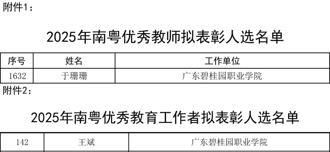 近日,广东省人力资源和社会保障厅、广东省教育厅发布2025年南粤优秀教师、南粤优秀教育工作者拟表彰对象公示名单,拟确定1679名南粤优秀教师拟表彰对象、170名南粤优秀教育工作者表彰对象。广东碧桂园职业学院2位教育工作者上榜!其中,校长助理、智能建造与设计学院院长王斌被评为“南粤优秀教育工作者”,数字经济与管理学院副院长于珊珊被评为“南粤优秀教师”。