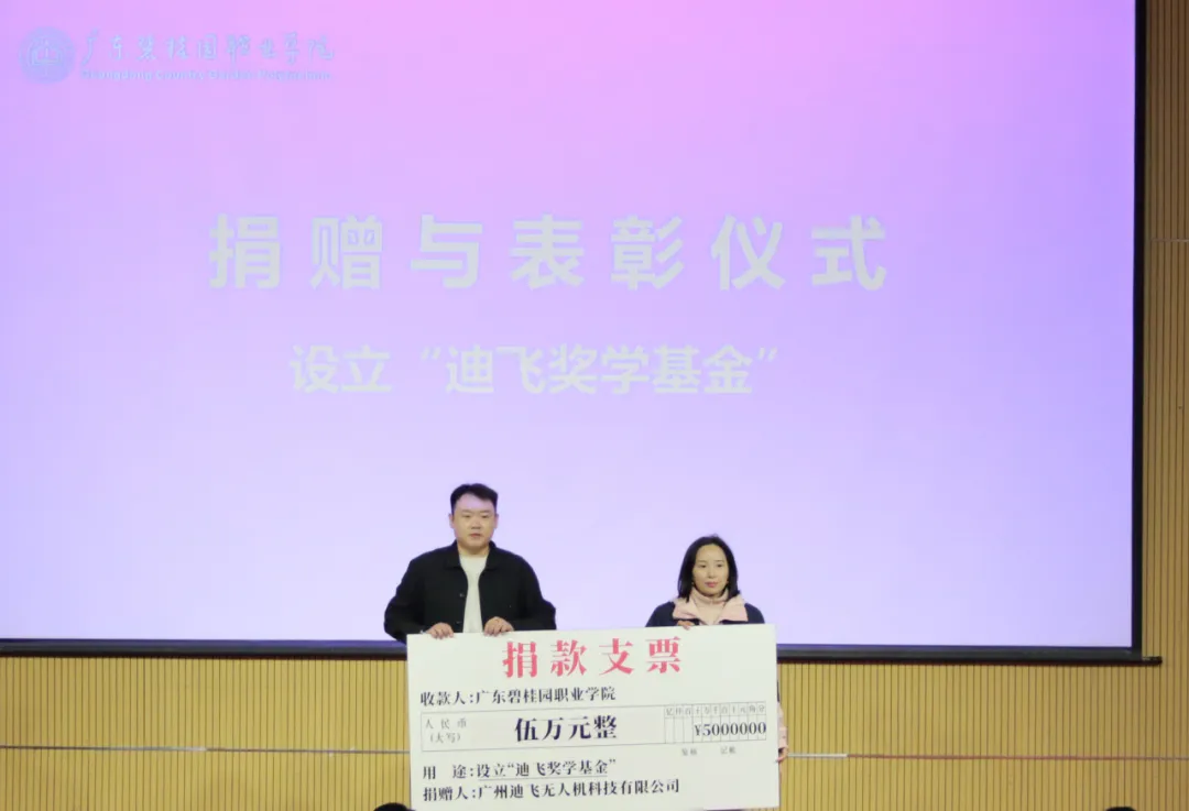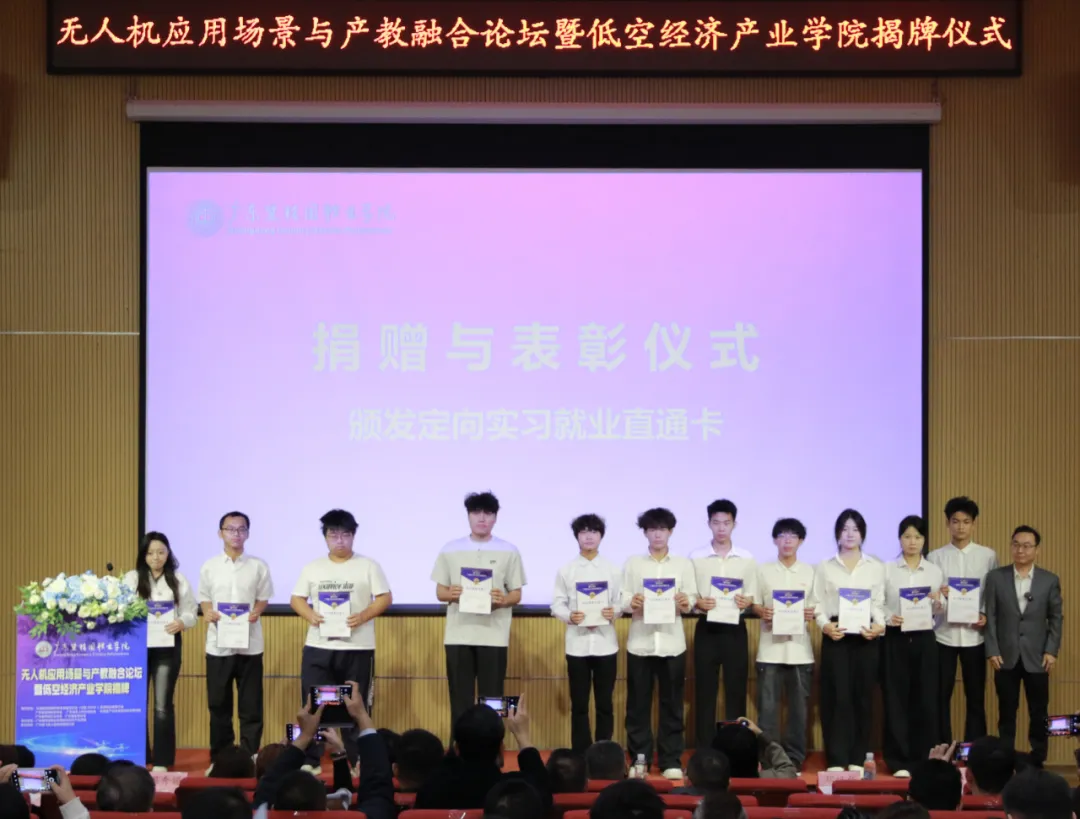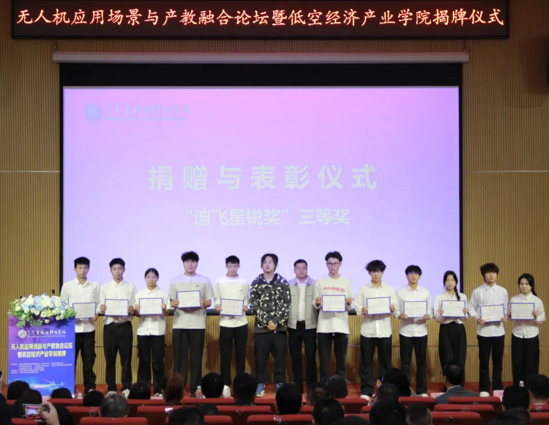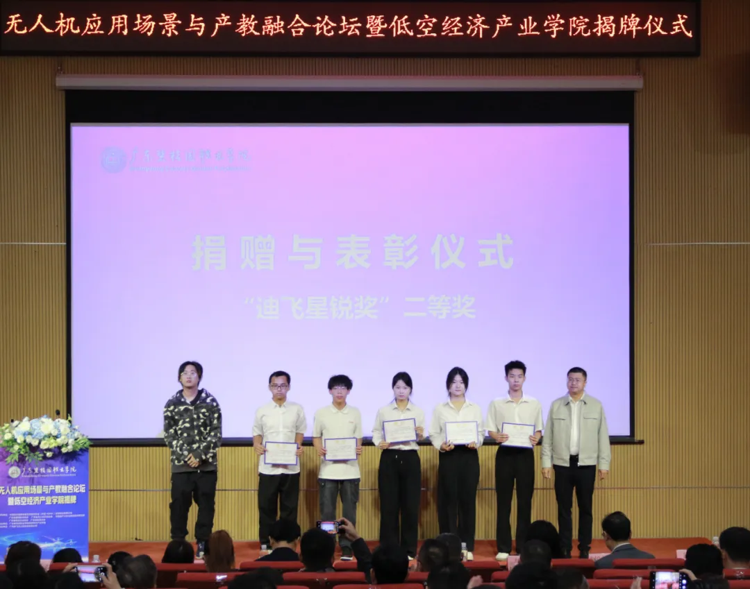 在捐赠与表彰仪式上,广州迪飞无人机科技有限公司宣布设立总额伍万元的“迪飞奖学基金”,并向低空经济产业学院捐赠了价值三十万元的设备。同时,公司为优秀学生代表颁发了“迪飞星锐奖”及定向实习就业直通卡。