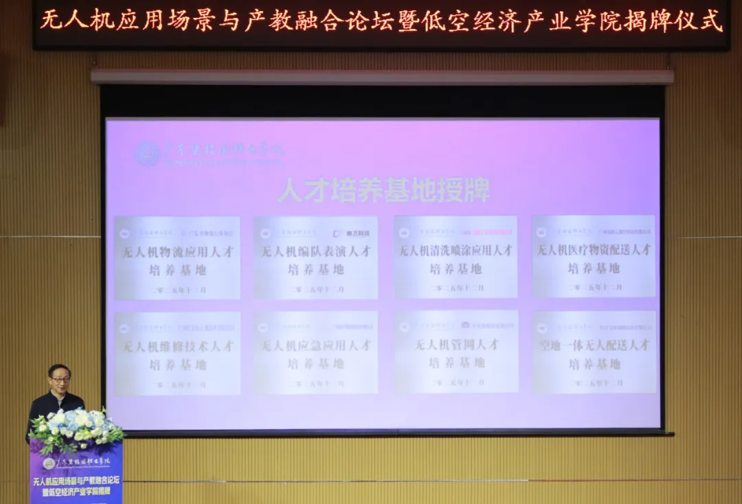 12月25日,学校举行无人机应用场景与产教融合论坛暨低空经济产业学院揭牌仪式。广东省通用航空协会、广东省无人机行业协会、全国高校创新创业联合体、中国生产力学会低空经济研究院、广东省物流行业协会、广东省职教城(清远)事务中心、广州迪飞无人机科技有限公司、广东省高校科研管理研究会、亿航智能设备有限公司等单位代表参加会议,围绕低空经济、无人机应用、产教融合等议题进行了交流探讨。