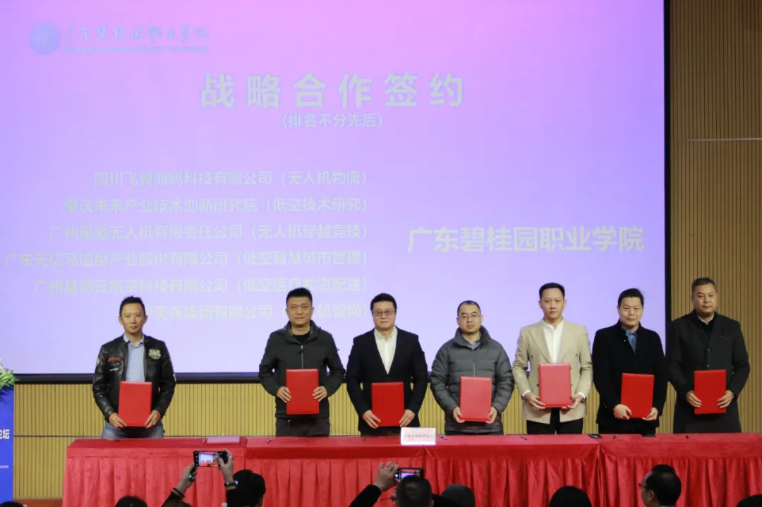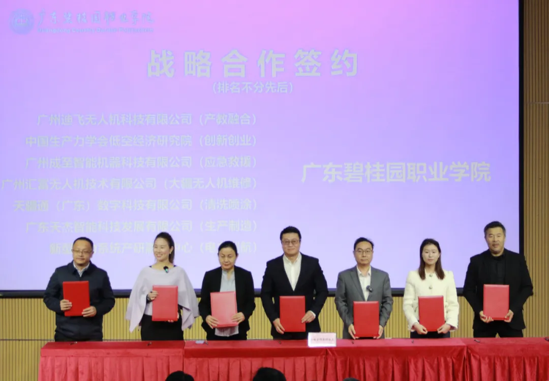 会上,学校与广州迪飞无人机科技有限公司等13家企业及机构签署合作协议,双方将在产教融合、创新创业、应急救援、无人机维修与制造、电力巡检、物流配送、低空技术研究、智慧城市管理、医疗物资投送、管网检测等十余个领域开展深度合作,共同开拓低空经济发展新局面。