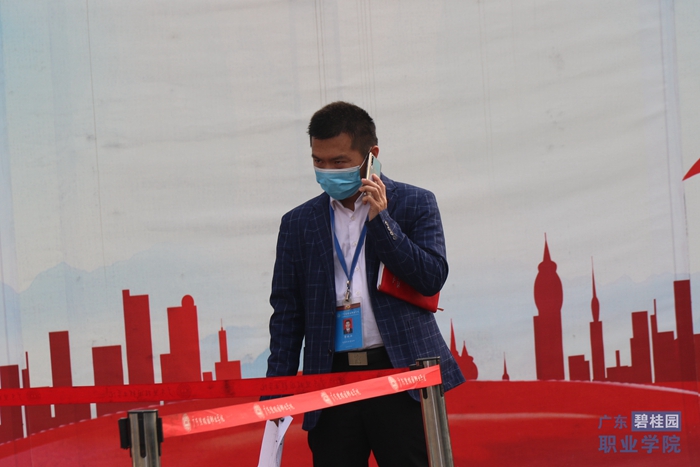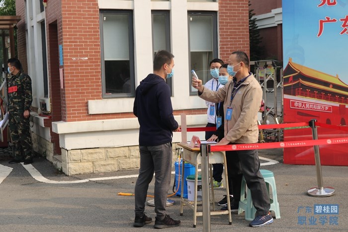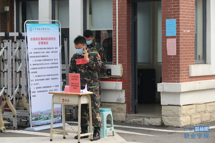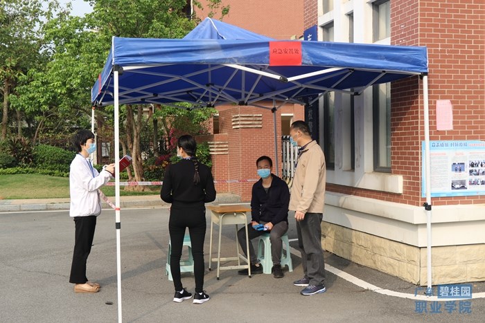 上午9:10,演练开始,预设一名湖北学生返校,在学院大门口车晚点发现体温达到38度,门岗值班人员立即将该同学带到门岗旁的应急安置处,并向校医和学生工作处处长核名如报告情况。经校医再次确认,该同学体温异常,协助其立即做好防护。校医告知执勤人员学生基本情况,学生戴一次性手套填写《个人健康状况登记表》,填写具体的抵达时间、旅居史、接触史、病史、目前健康状况和所乘交通工具等详细信息。与此同时,学生工作处处长立即向防空办主任彭振兴汇报了这一情况,彭主任了解情况后向学院防控领导小组汇报,立即启动应急处置预案,及时向清远市教育和防疫部门报告情况。