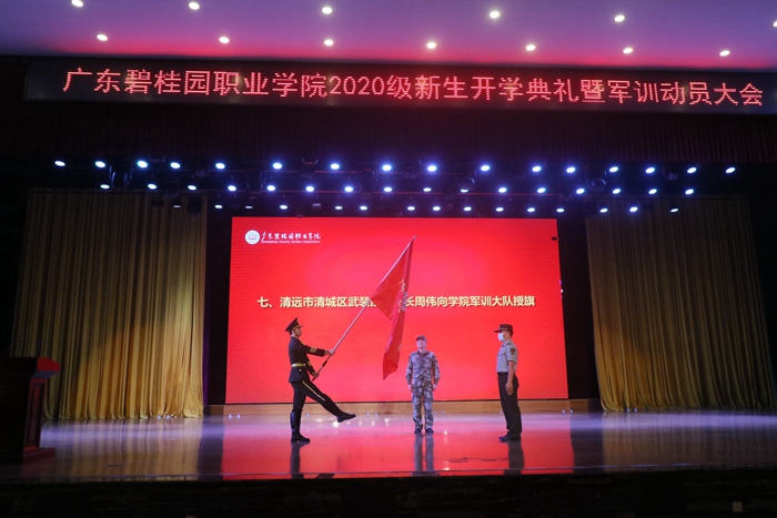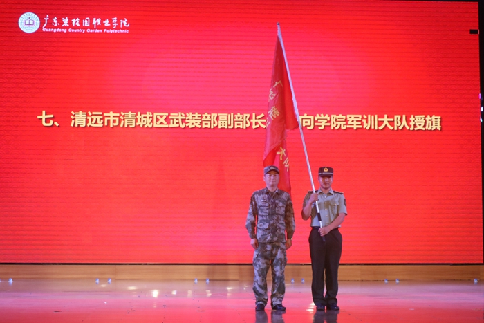 随后,清远市清城区武装部副部长周伟向学院军训大队授旗并作军训动员讲话。