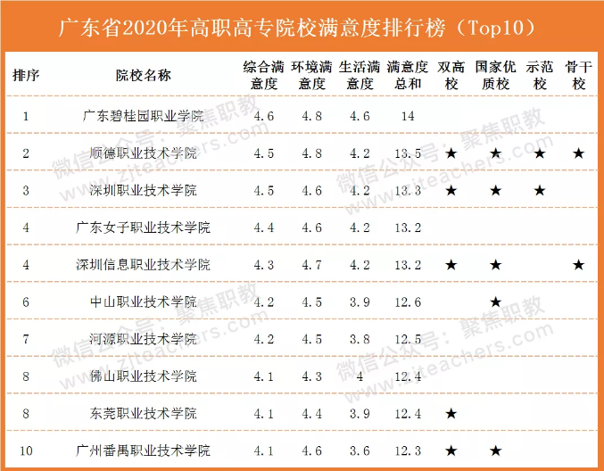 院校满意度评价指数包括:综合满意度、环境满意度、生活满意度,由在校生实名认证后进行点评。今年,广东碧桂园学院继续领跑,在高职高专院校中排名全国第三,全省第一。